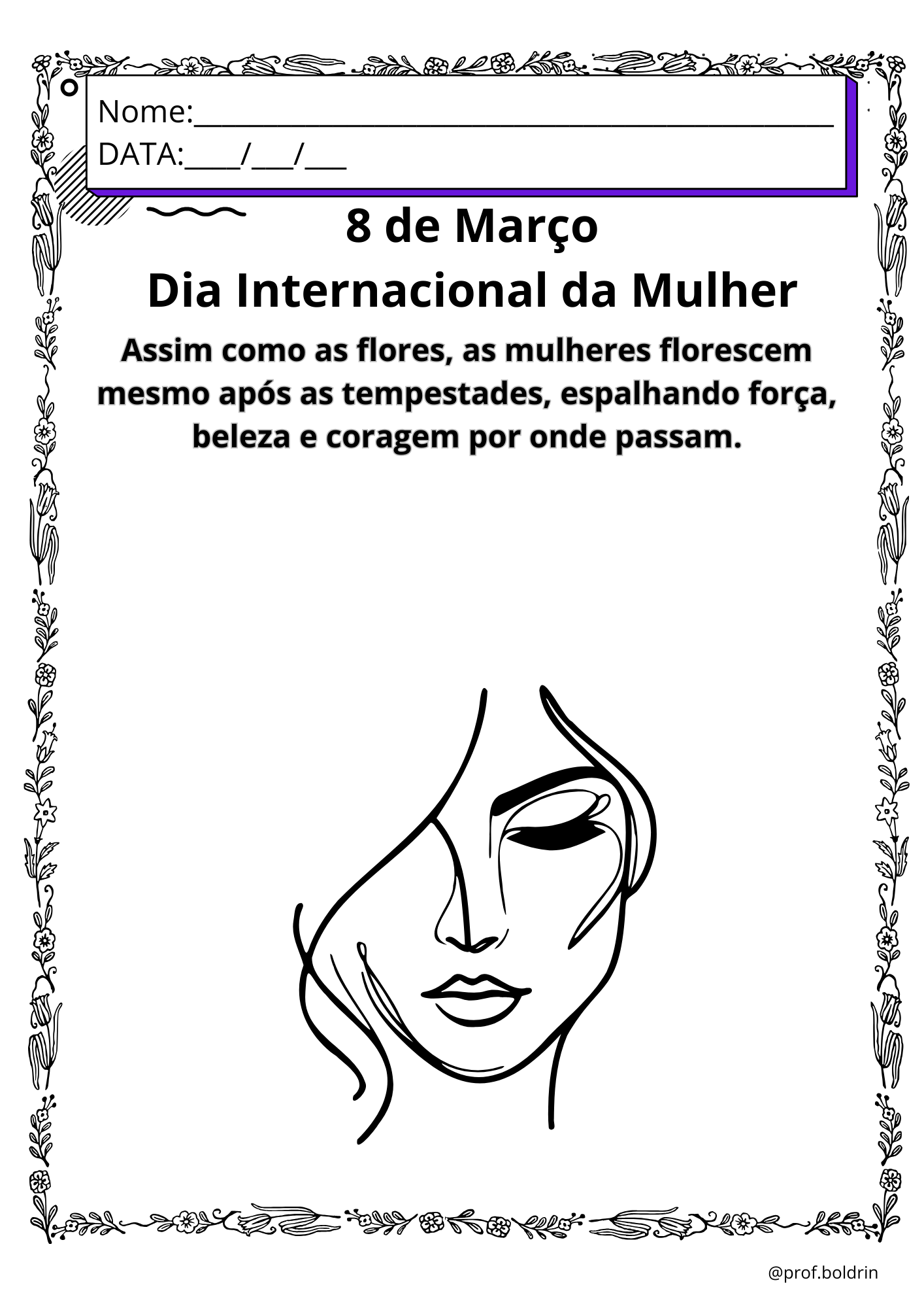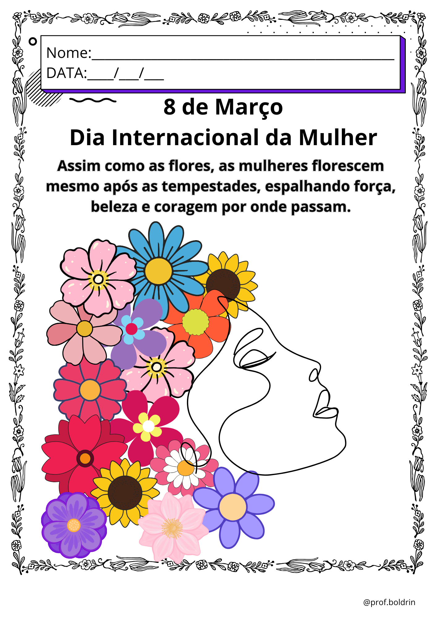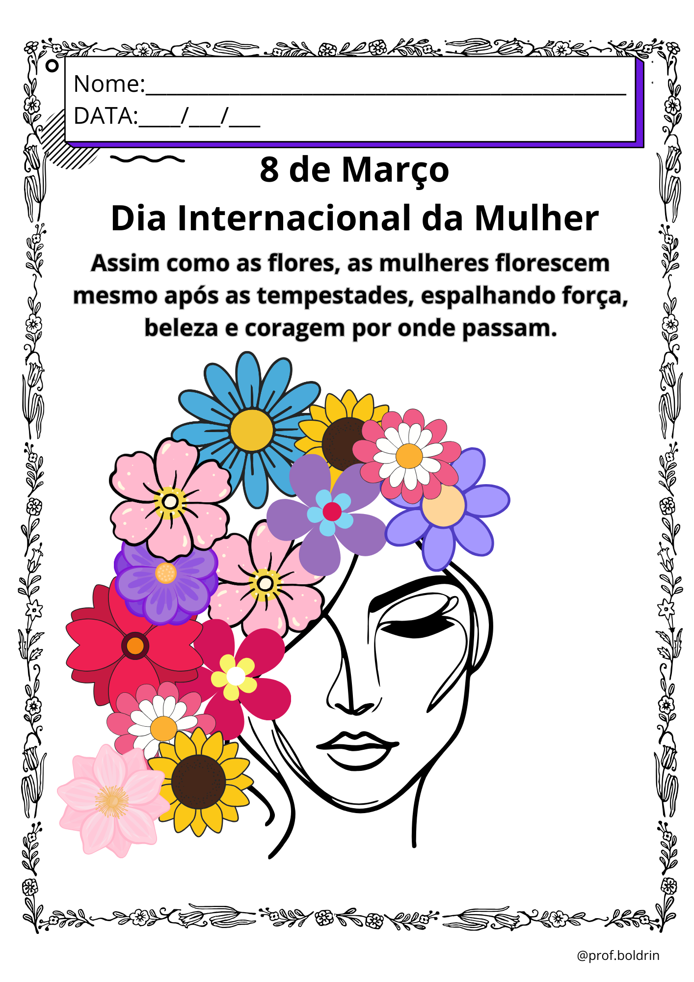 Os alunos poderão pintar, recortar e montar um lindo “cabelo de flores”, criando uma produção única e especial para homenagear as mulheres neste dia tão importante.