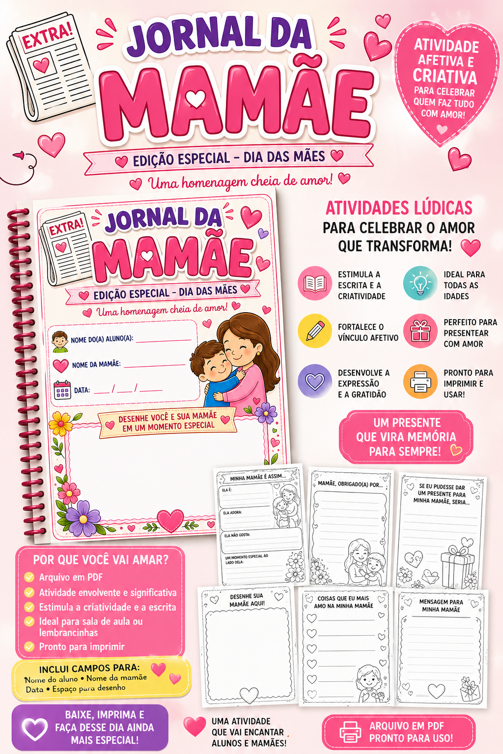 O Jornal da Mamãe foi desenvolvido para transformar o Dia das Mães em um momento especial de aprendizagem, carinho e conexão entre as crianças e suas famílias 💖