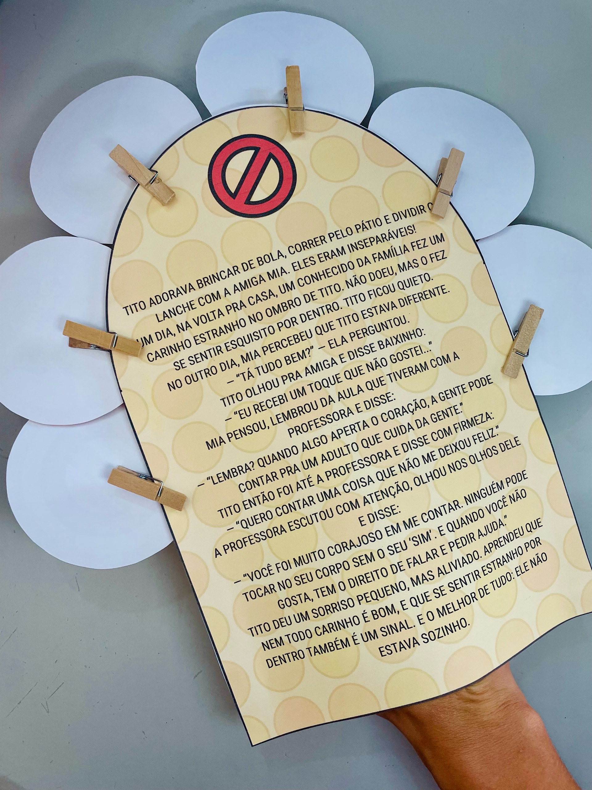 ✨ Luva de histórias com a narrativa “O Toque que Eu Não Gosto”