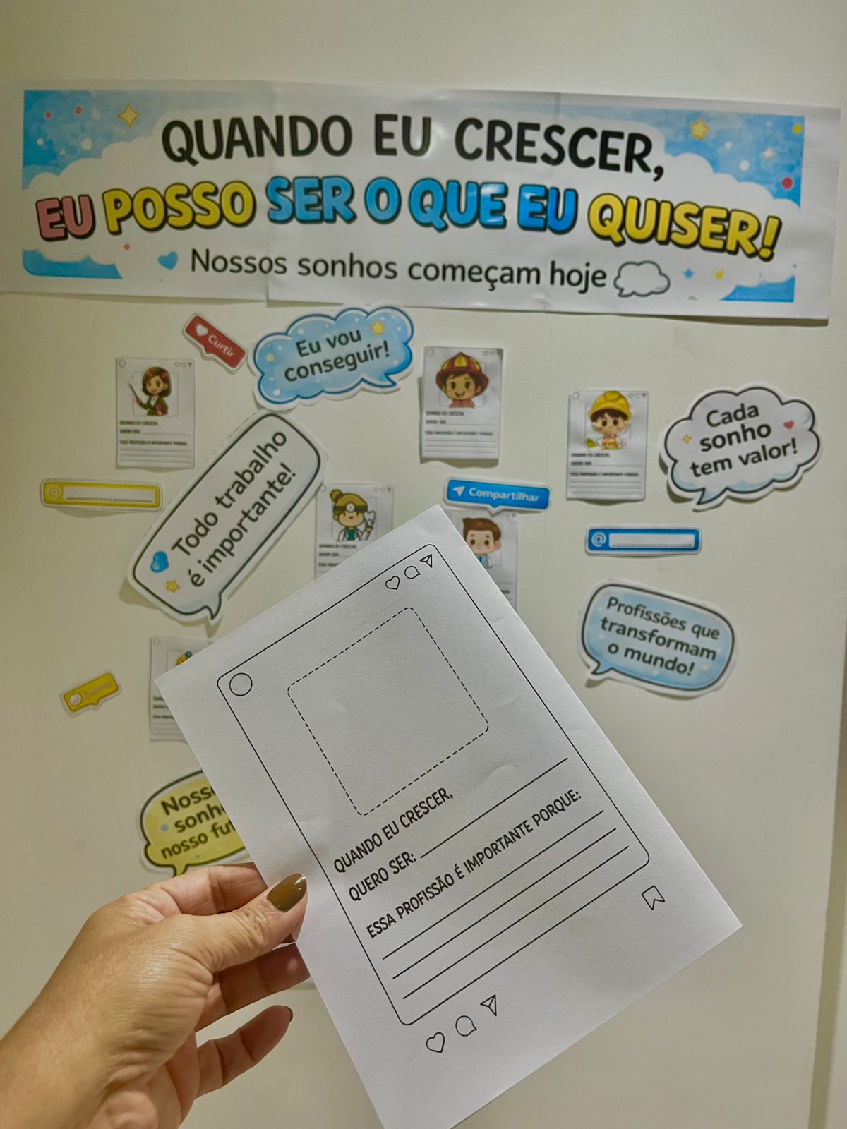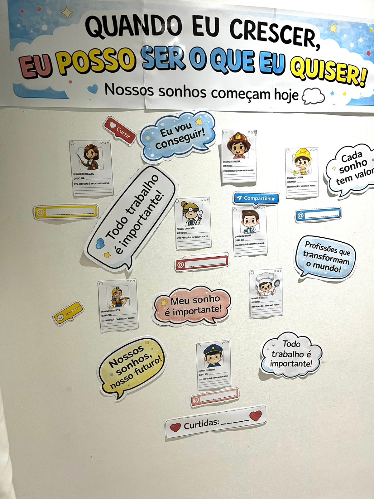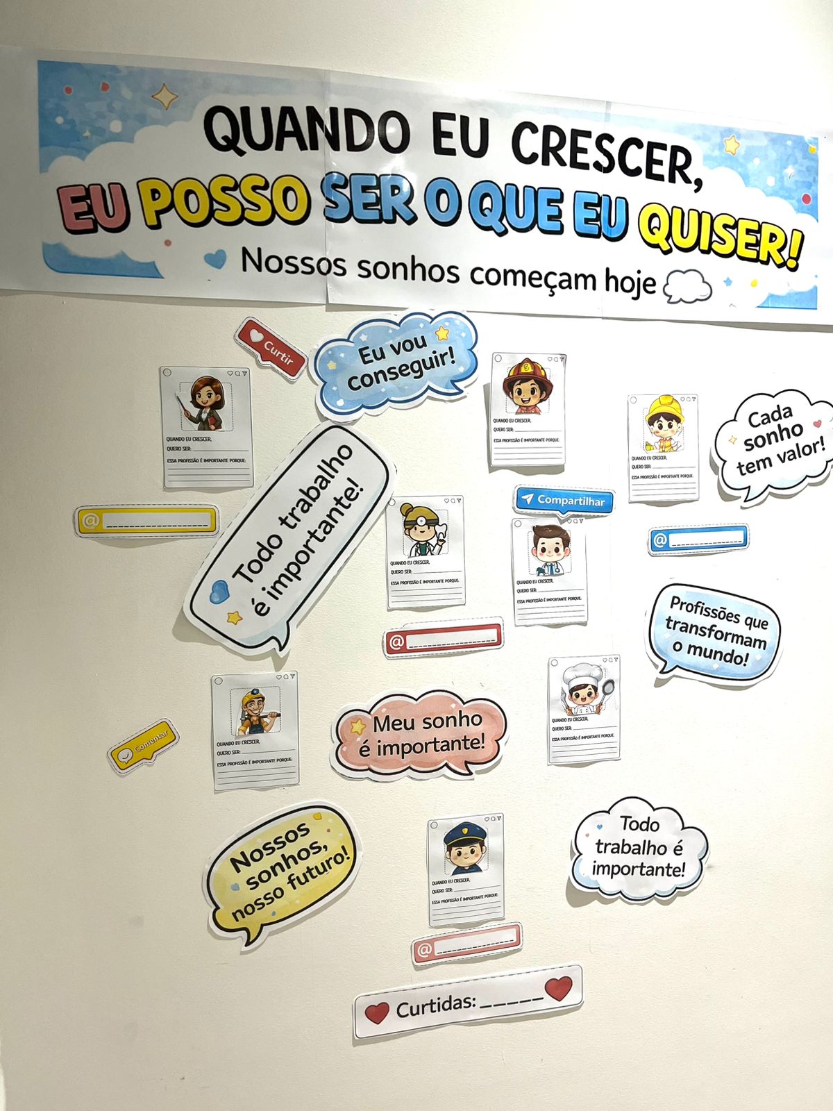 O Mural Interativo “Quando Eu Crescer” vai muito além de uma simples decoração… ele é uma experiência envolvente inspirada nas redes sociais, onde cada criança pode expressar seus sonhos e se sentir valorizada! 📱💛
